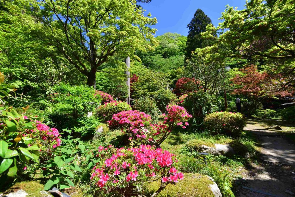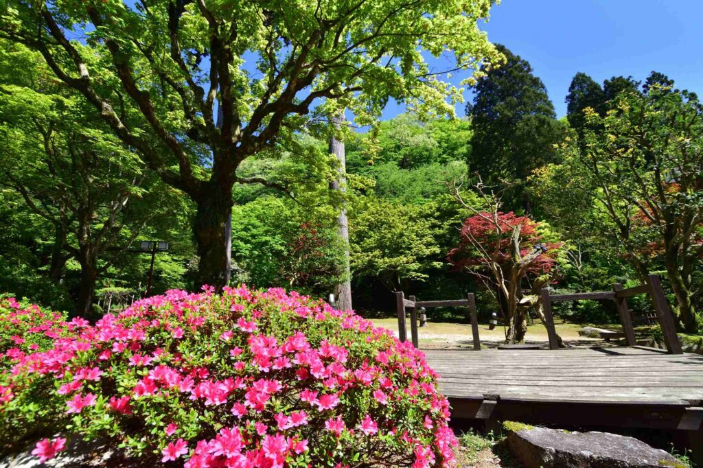 長生館の庭園は新緑萌え、ツツジも咲き始めました😊